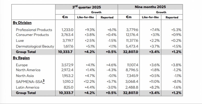 按地区来看,得益于中国大陆市场复苏的推动,欧莱雅在所有地区实现了增长。南亚太平洋地区、中东、北非和撒哈拉以南非洲地区(统称SAPMENA-SSA)以及拉丁美洲是集团增长最快的地区,前三季度销售额分别增长11%和8.2%,达到30.69亿欧元和24.89亿欧元;欧洲市场销售额增长3.6%至111.07亿欧元;北美市场销售额增长1.8%至87.97亿欧元;北亚地区销售额增长0.5%至73.46亿欧元,其中,中国大陆市场录得低个位数增长,市场呈现积极态势。