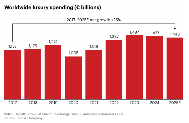 近日,贝恩公司联合意大利奢侈品行业协会发布第24版全球奢侈品市场研究报告显示,2025年全球奢侈品消费将以约1.44万亿欧元收官,按固定汇率计算在下降1%至增长1%之间。其中,个人奢侈品市场预计2025年年底达到3580亿欧元,同比下降约2%。报告预测,奢侈品市场将在2026年重回增长,增幅约为3%至5%。贝恩认为,未来10年个人奢侈品市场预计将以每年4%至6%的幅度增长,规模达到5250亿至6250亿欧元;奢侈品消费的整体市场规模则可能达到2.2万亿至2.7万亿欧元。