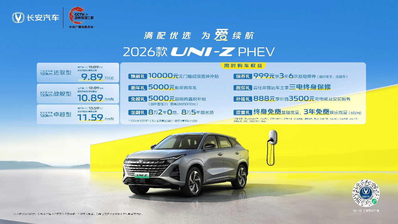 实现动力、舒适、科技三大进阶的2026款UNI-Z PHEV,将采用全系宁德纯电续航130km、2795mm长轴距大空间、天枢智能座舱、超大智慧双屏、豪车级电子怀档、50W无线充电、前排双层隔音玻璃、天枢驾驶辅助视觉版、18项主动安全等集于一身,功能齐全无短板,一步到位不将就,以满配实力树立10万级插混SUV的价值新标杆。此时正值上市限时活动推广期,新车更以9.89万元起的限时优惠诚意价,让2026款UNI-Z PHEV成为家庭用户购车首选。新店已到店,诚邀莅临品鉴,解锁更多幸福出行瞬间。
