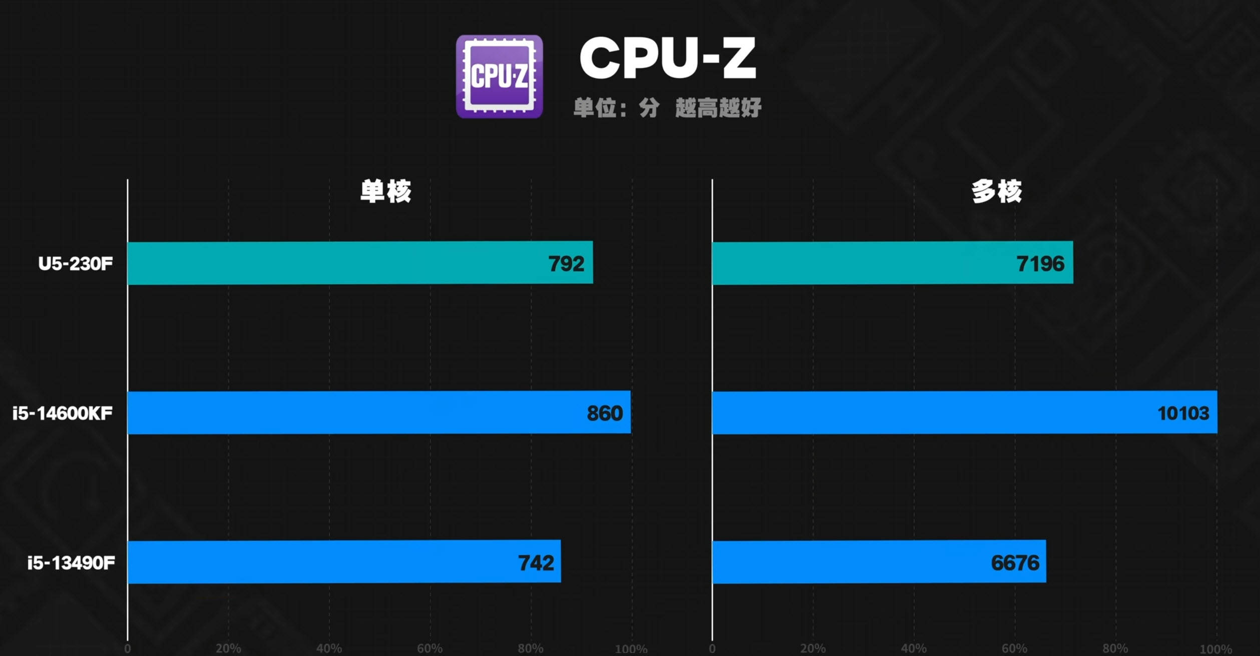 在实际性能表现上,英特尔(intel)酷睿Ultra5 230F处理器展现出惊人的越级实力。其单核性能在CPU-Z中得分高达782分,多核突破7196分,轻松超越上一代i5-13400F甚至i5-14400F。在Cinebench R23测试中,单核得分2074分,多核得分17853分,较AMD锐龙5 9500F领先17.2%,单线DMark CPU Profile测试中,单线分,最大线分,较前代产品有着明显的提升,与核心更多且定位更高的英特尔(intel)酷睿Ultra5 245K的差距也并不大。搭配上中高端显卡,畅玩目前的大型游戏都问题不大,不会在CPU性能这块拖后腿。