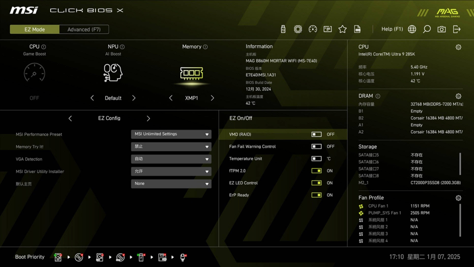 BIOS功能是微星MAG B860M MORTAR WIFI主板的另一大亮点。主板采用了全新的CLICK BIOS X界面,从高端MEG,中高端的MPG到甜点级的MAG系列的都配置了对应的主题。BIOS设置全面升级,从高端MEG,中高端的MPG到甜点级的MAG系列的都配置了对应的主题。高级设置菜单中,各类参数的设置依然按照用户已经熟悉的多层式结构陈列,并且提供了快速检索功能和收藏功能,常用设置可以自行进行快速定义,使用体验更加的便利。